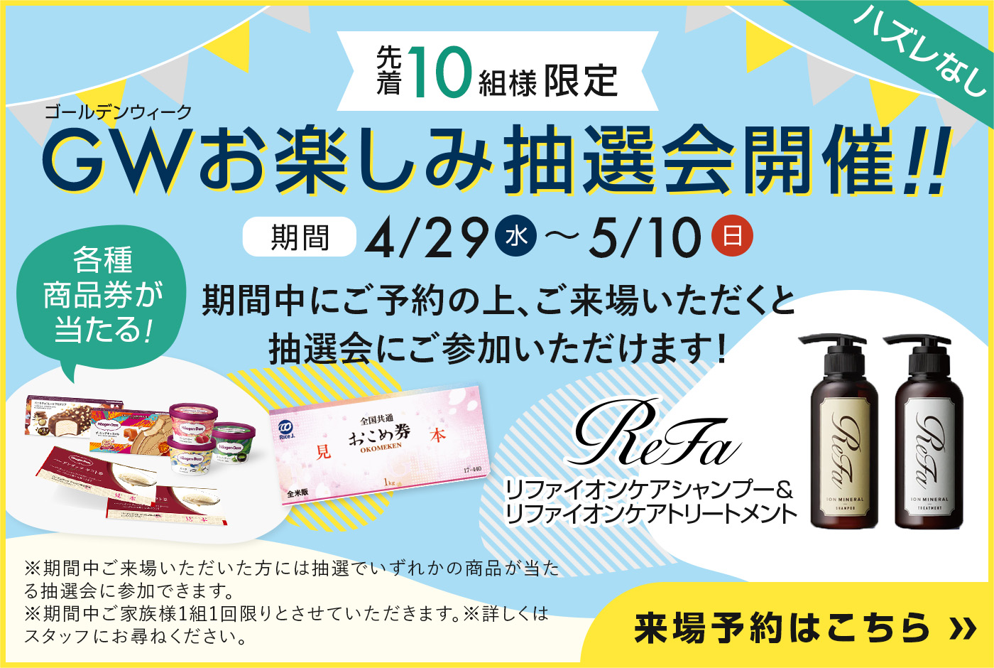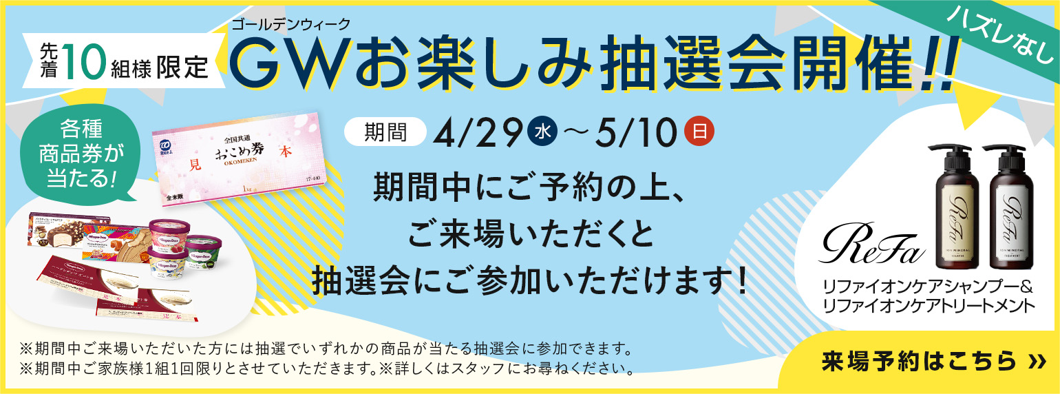 - GW期間中の4/29(水)~5/10(日)は休まず営業いたします。